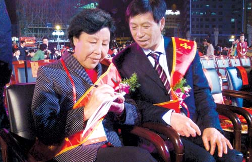 2008年11月9日,在首屆中國(guó)農(nóng)民歌會(huì)現(xiàn)場(chǎng),山西大寨村黨總支書(shū)記郭鳳蓮(左)和安徽小崗村黨委書(shū)記沈浩(右)相互簽名留念。郭鳳蓮和沈浩均表示要帶領(lǐng)全體村民,認(rèn)真貫徹十七屆三中全會(huì)精神,努力促進(jìn)農(nóng)村社會(huì)經(jīng)濟(jì)和諧發(fā)展。(夏樹(shù))