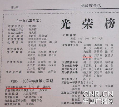 沈浩在上學(xué)期間所取得的成績,當(dāng)時(shí)已經(jīng)改名。(中廣網(wǎng) 陳曉冉攝)