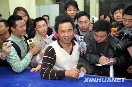 1月21日,廣州流花展館春運(yùn)火車票集中售取票點(diǎn)迎來第一位取實(shí)名制火車票的旅客,外來務(wù)工人員李建剛(前中)和他表弟劉超當(dāng)天一早通過電話訂到廣州至資陽的火車票。(圖片來源:新華社 劉大偉 攝)