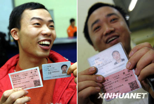 1月21日,外來務(wù)工人員李建剛(右圖)和他表弟劉超(左圖)通過電話訂票買到廣州至資陽的實(shí)名制火車票。(圖片來源:新華社 劉大偉 攝)