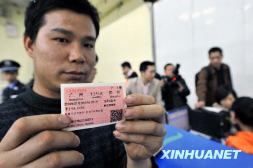 1月21日,一名旅客在廣州流花展館展示自己當(dāng)天早上通過電話訂到的廣州至鄭州的實(shí)名制火車票。(圖片來源:新華社 劉大偉 攝)