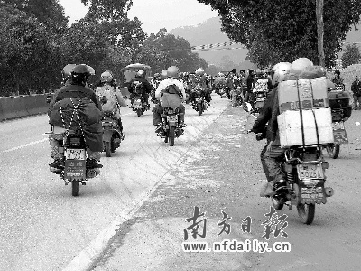 戴上頭盔、披上雨衣、載上家人,回家過年。春節(jié)臨近,由佛山、東莞、廣州等珠三角城市返鄉(xiāng)農(nóng)民工組成的10萬(wàn)“摩托車返鄉(xiāng)大軍”,沿著321國(guó)道返回廣西、貴州、湖南和四川老家過年。他們穿著厚實(shí)的棉衣,結(jié)實(shí)的綁腿,棉質(zhì)護(hù)膝,防風(fēng)頭盔,皮手套,或成群結(jié)隊(duì),或獨(dú)馬單騎,車上大多數(shù)是小兩口子,或者夾帶一個(gè)小孩,奔馳在國(guó)道上,成了春運(yùn)交通線上一道道特殊的風(fēng)景。