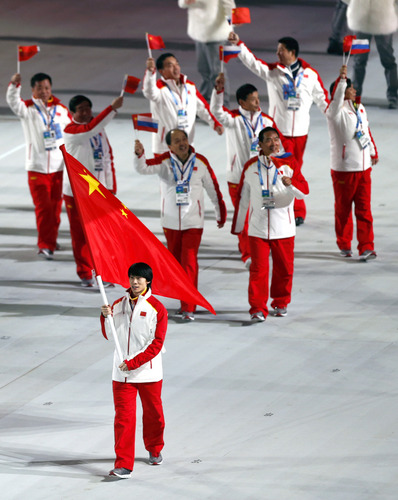 中國代表團(tuán)入場,旗手是花樣滑冰老將佟健,他已經(jīng)是第四次參加冬奧會。