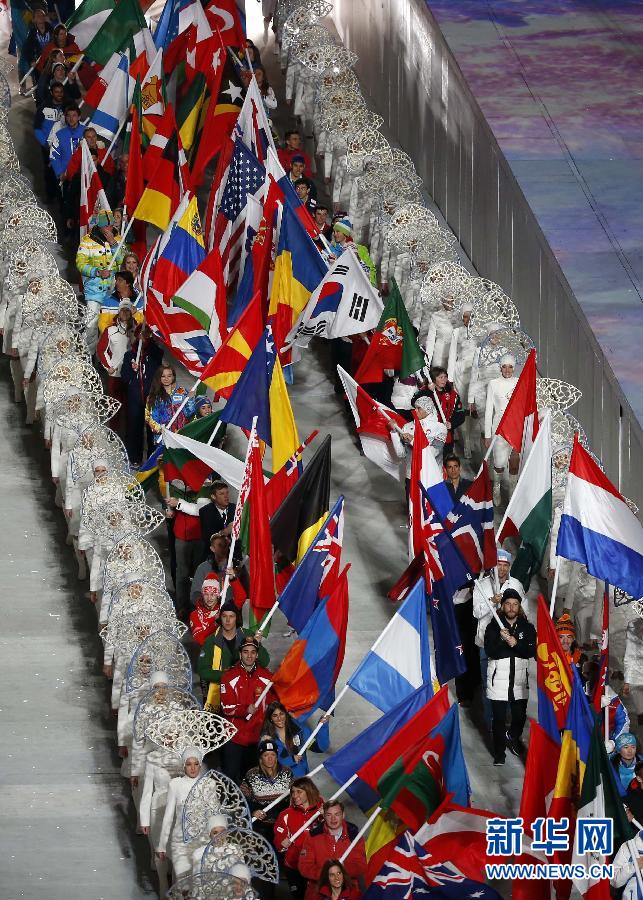 2月23日,各體育代表團旗幟在閉幕式上入場。當日,第22屆冬奧會閉幕式在菲施特奧林匹克體育場舉行。 新華社記者王麗莉攝
