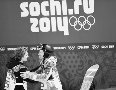 2月11日,肖恩·懷特(右)在比賽后與冠軍波德拉奇科夫相互致意。新華社記者 李 鋼攝