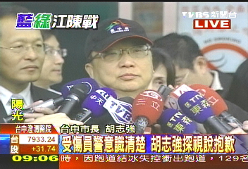 受傷警察意識(shí)清醒,在胡志強(qiáng)探視時(shí)還說(shuō)“抱歉”。來(lái)源:臺(tái)灣TVBS電視臺(tái)