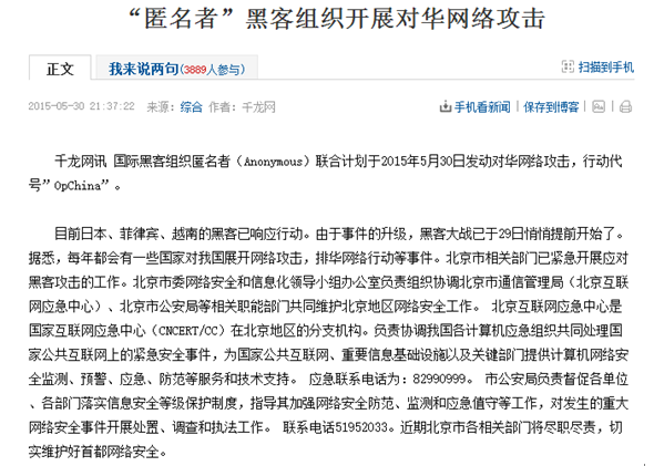 如今,面對(duì)紛雜的網(wǎng)絡(luò)空間環(huán)境,世界各國都在加緊布局網(wǎng)絡(luò)空間戰(zhàn)略,國家網(wǎng)絡(luò)安全周活動(dòng)即將開始,敏感日期將近,境外黑客在此之際,公開大肆宣傳要向中國發(fā) 起網(wǎng)絡(luò)攻擊,試問國內(nèi)某知名信息安全權(quán)威垂直專業(yè)媒體竟僥幸認(rèn)為各大媒體用自己的力量拉響警報(bào)是夸大宣傳,黑客攻擊是毛賊炒作行為,豈不謬哉?試問國內(nèi)某 知名信息安全權(quán)威垂直專業(yè)媒體居心何在?!