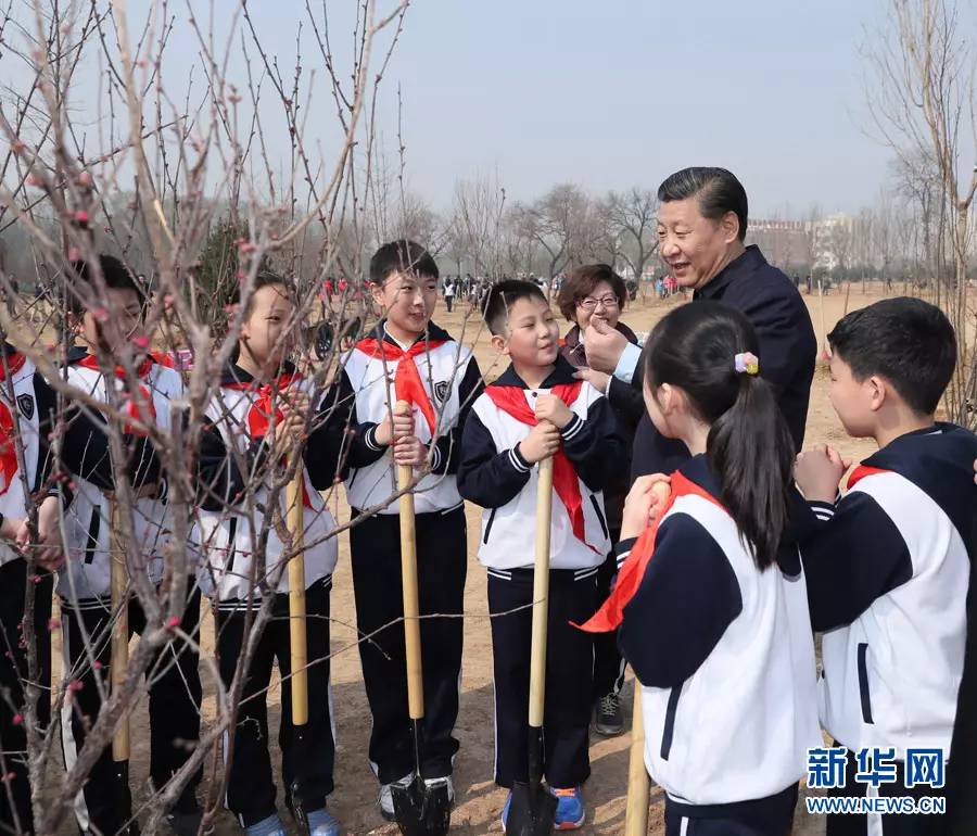 2017年3月29日,黨和國家領(lǐng)導人習近平、張德江、俞正聲、劉云山、王岐山、張高麗等來到北京市朝陽區(qū)將臺鄉(xiāng)參加首都義務植樹活動。這是習近平同參加植樹的少先隊員交談。
