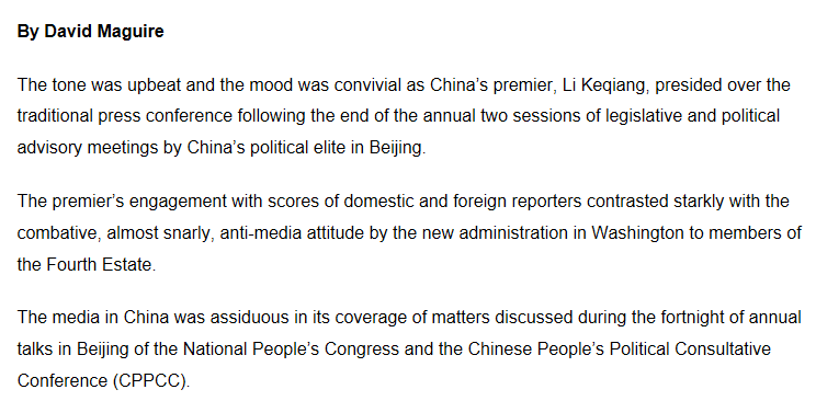 穿著深色西服打著柔和的藍(lán)色領(lǐng)帶,李總理在人民大會堂上演了又一場精彩的記者答問會。他親切地對用中文提問的外國記者說“你的普通話很好啊”,“你有很大的勇氣用中文表達(dá)所有的問題”。李總理對中外媒體記者親切和藹的態(tài)度與新一屆美國政府對媒體不甚友善的態(tài)度形成天差地別的鮮明對比。
