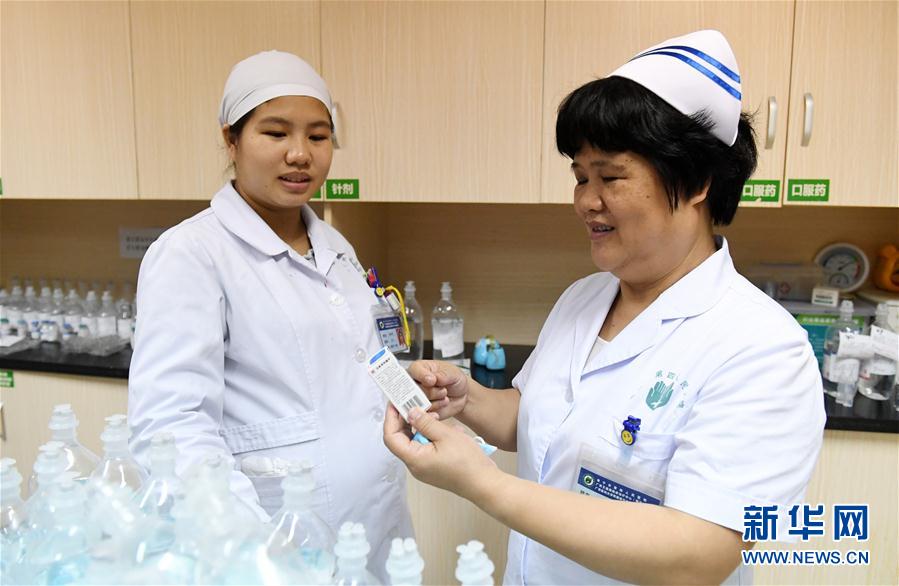 在南寧市第四人民醫(yī)院,杜麗群(左)和護(hù)士交流工作(9月18日攝)。新華社記者 陸波岸 攝