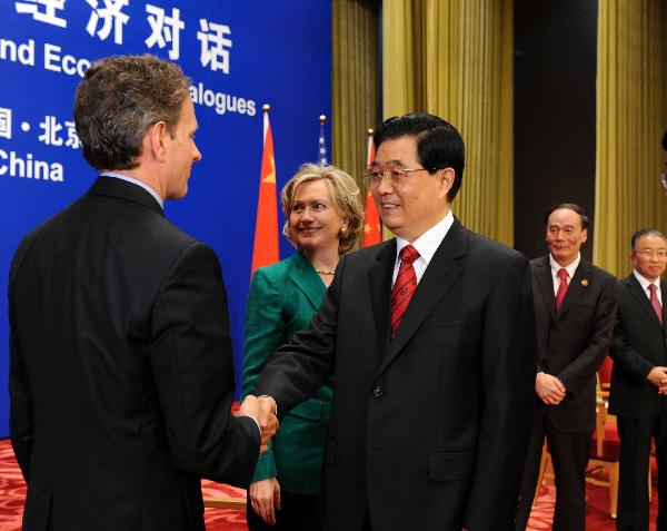 5月24日,國家主席胡錦濤在北京人民大會堂出席第二輪中美戰(zhàn)略與經(jīng)濟對話開幕式并發(fā)表重要講話。這是胡錦濤同美國財政部長蓋特納握手。新華社記者饒愛民攝