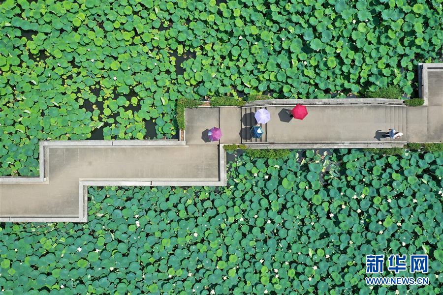 6月27日,游客在湖南省衡陽市石鼓區(qū)西湖公園一處棧道上賞花游玩(無人機(jī)照片)。 據(jù)文化和旅游部公布的端午小長假旅游統(tǒng)計數(shù)據(jù),6月25至27日,全國累計接待國內(nèi)游客4880.9萬人次,累計實現(xiàn)國內(nèi)旅游收入122.8億元。 新華社發(fā)(羅盟 攝)