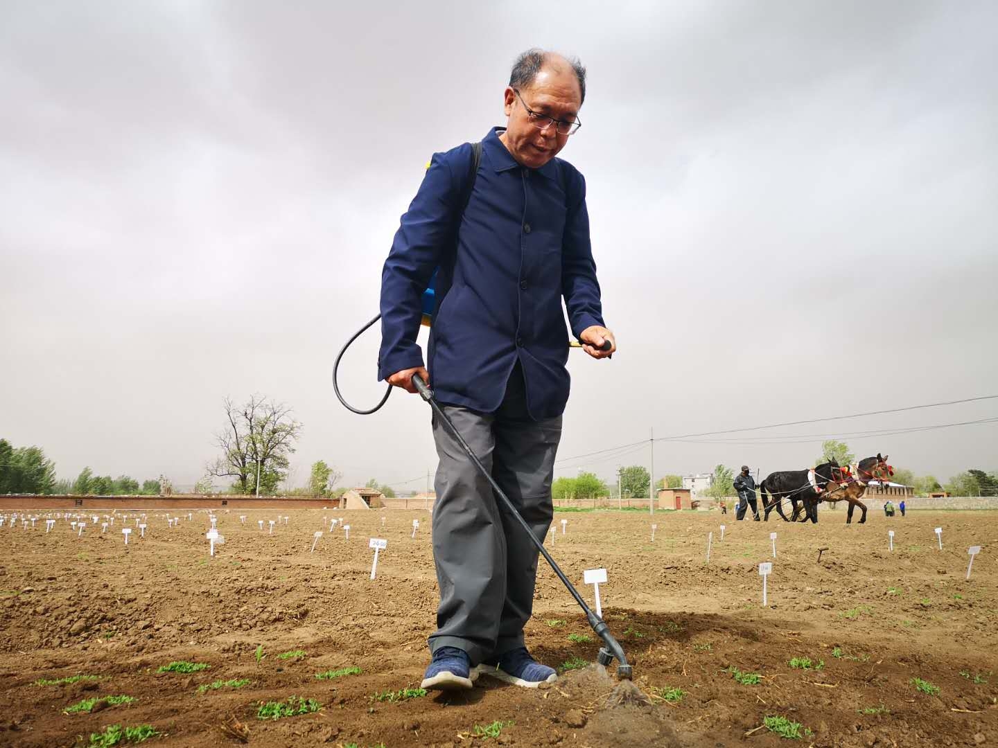 5月11日下午,好不容易見到他,他卻背著噴霧器為2畝大的實(shí)驗(yàn)田里的谷種噴藥,為的是從每窩200多株苗中選出最優(yōu)的一顆種子,這樣的小事本應(yīng)讓年輕人來做,可他不是不信任年輕人,而是為了抓住出苗的關(guān)鍵節(jié)點(diǎn),搞到第一手資料,便于今后的研究;他更是與時間在賽跑,在已經(jīng)成功用一粒種子改變世界、破解了谷子雜交世界級難題的基礎(chǔ)上,又在為世界糧食安全找突破口,尋求更高的產(chǎn)量。他就是“南有袁隆平,北有趙治海”的“雜交谷子之父”——全國人大代表、張家口市農(nóng)科院研究員趙治海。