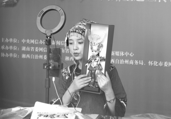 11月18日,湘西州花垣縣十八洞村,參加“決勝2020”網(wǎng)絡(luò)主題活動(dòng)的主播正在直播介紹苗族風(fēng)情產(chǎn)品。圖/石林榮
