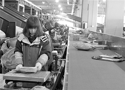 圓通公司員工在為快件稱重。本報(bào)記者 李鵬翔攝