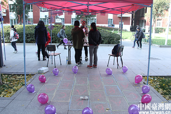 北京師范大學(xué)兩岸四地青年交流協(xié)會(huì)的學(xué)生們?cè)缭绲貋淼襟w育館外布置攤位,他們?yōu)閮砂端牡厍嗄杲涣魉龅呐,如同陽光在這個(gè)寒冷的初冬讓人感到溫暖。