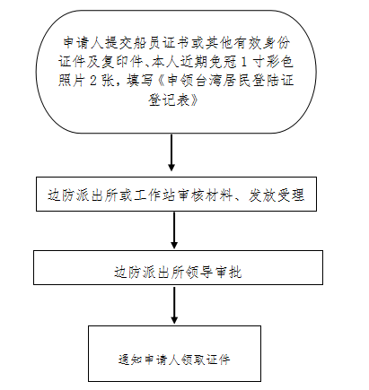 申請人填寫《申領(lǐng)臺(tái)灣居民登陸證申請表》,向服務(wù)臺(tái)輪停泊點(diǎn)邊防派出所(工作站)提交相關(guān)申請材料。