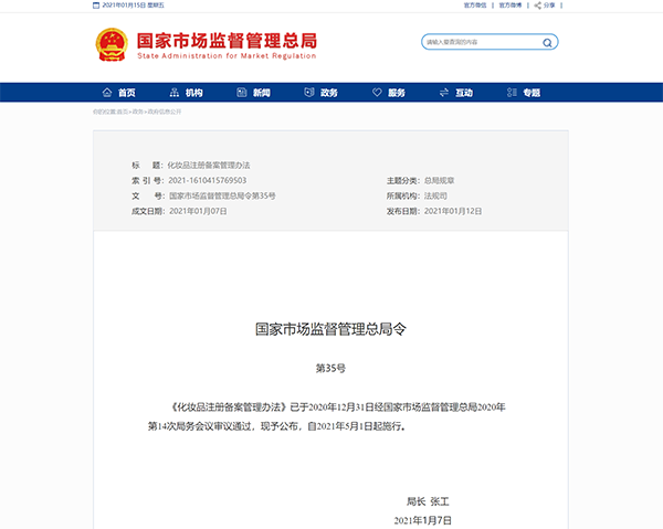 國家市場監(jiān)督管理總局日前發(fā)布了《化妝品注冊備案管理辦法》。