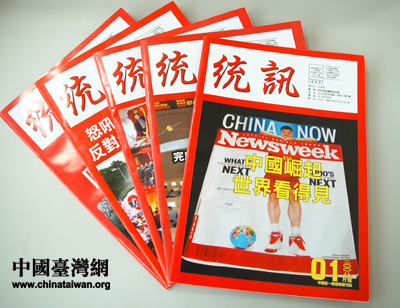 王津平向中國臺灣網(wǎng)記者贈送的中國統(tǒng)一聯(lián)盟機(jī)關(guān)刊物《統(tǒng)訊》 |