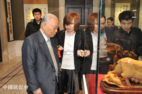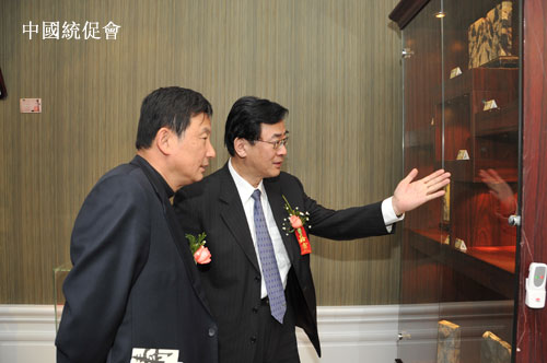 中國和平統(tǒng)一促進會執(zhí)行副秘書長李路(右)和副秘書長王安南(左)參觀展覽