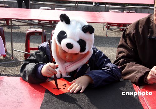 1月18日,臺灣2009己丑年全民迎新春聯(lián)揮毫在臺北“國父紀念館”舉行。圖為一名戴熊貓頭套的學(xué)童正在認真寫聯(lián)。中新社發(fā) 陳立宇 攝