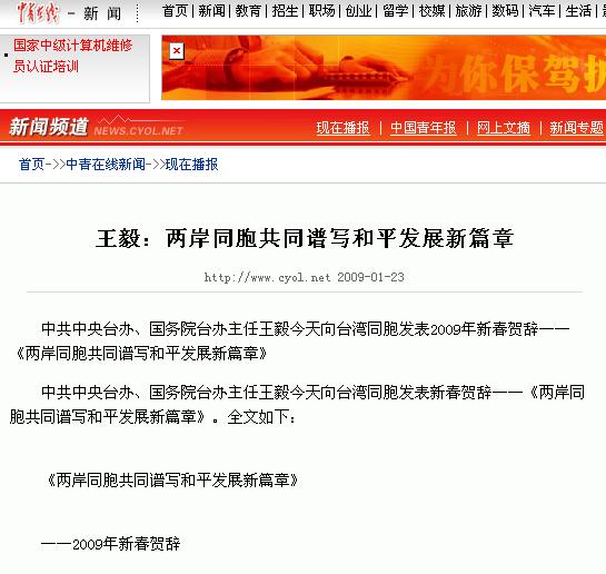 中共中央臺(tái)辦、國(guó)務(wù)院臺(tái)辦主任王毅今天向臺(tái)灣同胞發(fā)表2009年新春賀辭——《兩岸同胞共同譜寫(xiě)和平發(fā)展新篇章》