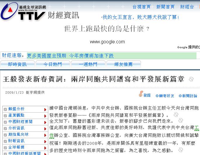 據(jù)中國(guó)臺(tái)灣網(wǎng)消息,中共中央臺(tái)辦、國(guó)務(wù)院臺(tái)辦主任王毅今天向臺(tái)灣同胞發(fā)表新春賀辭——《兩岸同胞共同譜寫(xiě)和平發(fā)展新篇章》。