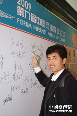 第九屆中國網絡媒體論壇將于明天開幕,圖為參會嘉賓在簽名版前簽名留念。(中國臺灣網 陳寧 攝)