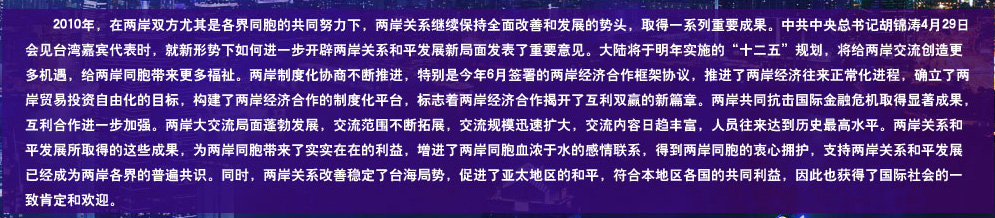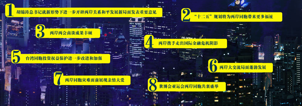 胡錦濤總書記就新形勢(shì)下進(jìn)一步開辟兩岸關(guān)系和平發(fā)展新局面發(fā)布重要意見 “十二五”規(guī)劃將為兩岸同胞帶來更多福祉 兩岸兩會(huì)商談成果豐碩 兩岸攜手走出國際金融危機(jī)陰影 臺(tái)灣同胞投資權(quán)益保護(hù)進(jìn)一步改進(jìn)和加強(qiáng) 兩岸大交流局面蓬勃發(fā)展 兩岸同胞災(zāi)難面前展現(xiàn)親情大愛 世博會(huì)亞運(yùn)會(huì)兩岸同胞共襄盛舉