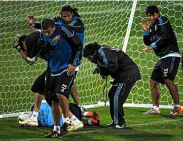阿根廷的整堂訓(xùn)練課都充滿了歡聲笑語(yǔ),笑聲持續(xù)不斷的從球員和馬拉多納所在的地方傳過(guò)來(lái)。一開(kāi)始他們進(jìn)行的是分組對(duì)抗,結(jié)果梅西和伊瓜因一方以3-1輕松勝出,另外一方打進(jìn)唯一進(jìn)球的是進(jìn)來(lái)轉(zhuǎn)狀態(tài)極為出色的特維斯。之后馬拉多納還組織了防守演練,和中場(chǎng)對(duì)抗。而他們對(duì)抗的目標(biāo)就是以梅西和伊瓜因?yàn)槭椎陌⒏⒑廊A進(jìn)攻群。