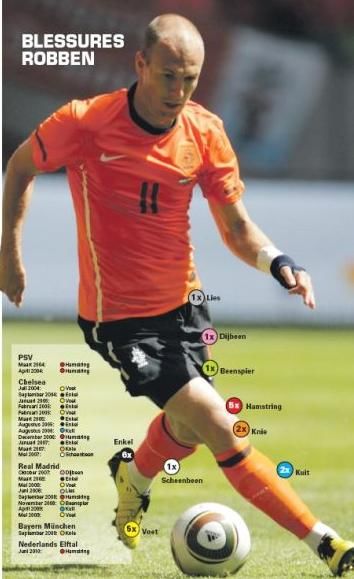 荷蘭《電訊報(bào)》表示,這已經(jīng)是羅本職業(yè)生涯開(kāi)始以來(lái),腿部的第24次受傷,如果沒(méi)有奇跡發(fā)生的話,羅本將肯定缺席本屆世界杯。