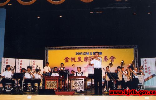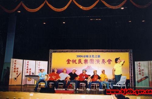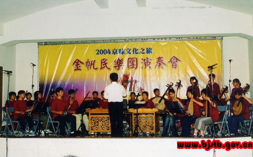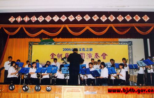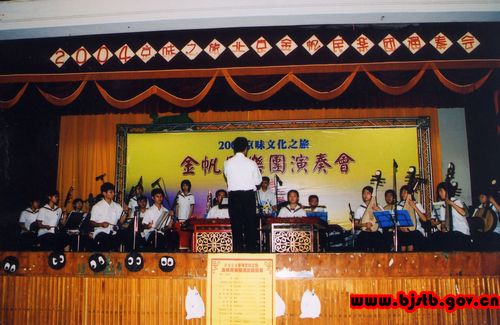 承擔此次赴臺的京味文化之旅民樂表演的是我市第十二中學的金帆民樂團,別看他們都是普通的中學生,但進行民樂的學習已有多年的歷史,他們的演奏水平一點不比專業(yè)樂團遜色,他們曾多次在全國的民樂比賽中獲獎,并多次代表我市中學生參加國際的藝術(shù)交流活動,弘揚民族藝術(shù)。這次來到祖國寶島臺灣,他們的表演更是精彩。一曲《京調(diào)》仿佛使人們在觀賞一臺京劇表演,聯(lián)想起那字正腔圓的唱詞、陰陽頓挫的過門;《春將花月夜》本是傳統(tǒng)音樂中的“山水名曲”,在這首樂曲的伴奏下,朗誦一篇散文,把北京的風景名勝向大家做一介紹也別有一番意境;一段彈撥樂《賽馬》又把觀眾帶到中國北方的大草原,好象親眼看到賽馬時烈馬奔馳、熱烈歡快的景象;《夜深沉》是京劇《霸王別姬》中的一個曲牌,也是全場演出中難度最大的曲目,京胡的一張一弛表達了虞姬和項羽訣別的剎那,琵琶和揚琴的一緊一慢表達出虞姬舞劍時的慷慨激憤,大鼓的一招一試又有如萬馬奔騰的疆場,整曲流暢激昂、一氣呵成。場內(nèi)觀眾興致勃勃地欣賞著演出,對小演員演奏出的美妙聲音所折服,特別是當樂隊演奏臺灣同胞熟悉的《童年》、《丟丟銅》等臺灣民謠樂曲時,他們的情緒更加高漲,掌聲一浪高過一浪。每場演出結(jié)束前,樂隊的主持人都不忘向全體觀眾發(fā)出邀請,希望2008年相約北京奧運會。
