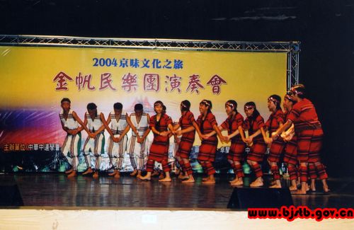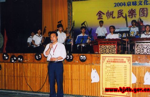 2004年9月7日——17日,第四屆“京味文化之旅”赴臺灣地區(qū)進行文化交流活動,本屆“京味文化之旅”以“交流感情、增進友誼、面向未來、加強理解”為宗旨,以中國傳統(tǒng)文化為紐帶,以北京現(xiàn)代風貌為窗口,增強臺灣民眾對祖國大陸的認同感,促進兩岸青少年的雙向交流與互動關(guān)系,擴大彼此間的相互認識與了解。活動在繼續(xù)堅持面向臺灣基層民眾的基礎(chǔ)上,成功地走進了臺灣校園,將工作目標鎖定在臺灣中學生身上。通過來自北京的同齡中學生的民樂表演和“魅力北京”圖片、圖書展覽等系列活動,讓臺灣的學生了解祖國、了解北京,體驗中華民族歷史的悠久和文化的燦爛,從而激發(fā)他們認同兩岸同根同祖的意識。在臺10天里,“京味文化之旅”一行先后來到卓蘭、苗栗、臺中、板橋等地進行展演,觀眾累計上萬人。