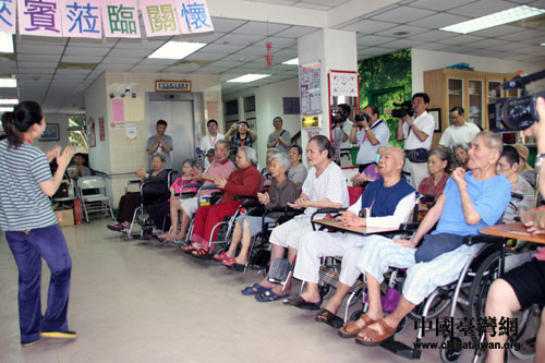 “高山青、澗水藍……”在“超女”李娜悠揚及極富帶動性的歌聲中,嘉義利河伯養(yǎng)老院的70余位老人一起唱起了這首傳唱度極高的報道歌曲!肮穪啠鄙钤谶@里的張林滿老人在歌聲中淚流滿面,“這是我很熟悉的旋律,她長的很清秀,看到她活潑的樣子就像看到了自己的孩子一樣,很溫暖”。雖然老人夾雜著閩南語的普通話記者并不能完全聽懂,但她眼中的淚水卻代表了千言萬語。