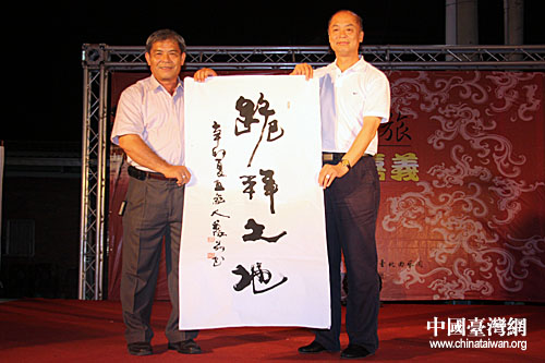 北京市文學藝術(shù)界聯(lián)合會駐會副主席黎晶揮毫潑墨,寫下“跪拜天地”四個大字,將展演氣氛推向高潮。黎晶并現(xiàn)場賦詩一首,表達自己激動的心情:“我們從北京牽出一條飄帶/你們從臺灣牽出一條飄帶/兩條彩色飄帶飄落在文隆村/打了一個結(jié)/從此我們的手牽手/從此我們的心連心……”(記者 董潔 圖/文)
