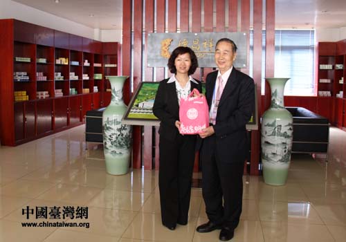 臺灣嘉賓走進(jìn)貴陽扎佐鎮(zhèn)醫(yī)藥園區(qū)參觀考察,企業(yè)負(fù)責(zé)人正與臺灣中藥公會理事長、交流參訪團(tuán)嘉賓林所先生交換禮品(貴陽市臺辦 李慶斌 攝)