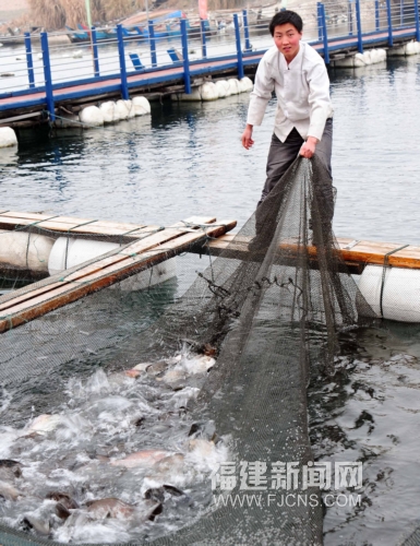 1月4日,一位連江漁民正在還上養(yǎng)殖漁排收網。據福建省海洋與漁業(yè)廳透露,2009年福建省對臺水產品出口創(chuàng)歷史新高,僅前11個月對臺水產品出口3.55萬噸,創(chuàng)匯2.08億美元,出口量、出口金額均居大陸各省首位。(張麗君 攝)