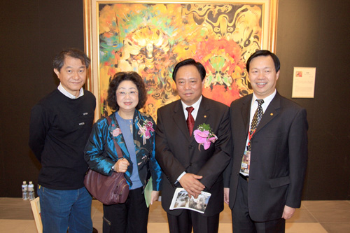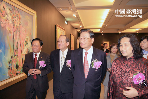 中國(guó)臺(tái)灣網(wǎng)1月30日臺(tái)北消息 30日上午,2010中國(guó)國(guó)粹油畫(huà)藝術(shù)精品展在臺(tái)北市孫中山紀(jì)念館開(kāi)幕。中華全國(guó)臺(tái)灣同胞聯(lián)誼會(huì)會(huì)長(zhǎng)梁國(guó)揚(yáng)、臺(tái)灣;鶗(huì)董事長(zhǎng)江丙坤參觀了畫(huà)展!。ㄖ袊(guó)臺(tái)灣網(wǎng) 田云鵬 攝)