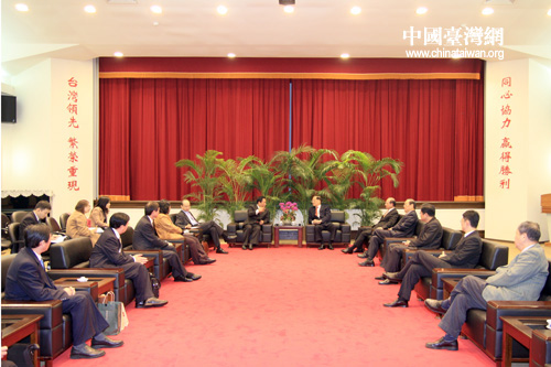 中國(guó)臺(tái)灣網(wǎng)2月1日臺(tái)北消息 中華全國(guó)臺(tái)灣同胞聯(lián)誼會(huì)會(huì)長(zhǎng)梁國(guó)揚(yáng)一行,1日在臺(tái)北拜會(huì)了中國(guó)國(guó)民黨榮譽(yù)主席連戰(zhàn)。梁國(guó)揚(yáng)向連戰(zhàn)介紹了全國(guó)臺(tái)聯(lián)的有關(guān)情況以及在臺(tái)北舉行的“2010中國(guó)國(guó)粹油畫(huà)藝術(shù)精品展”。連戰(zhàn)表示,全國(guó)臺(tái)聯(lián)梁國(guó)揚(yáng)會(huì)長(zhǎng)一行,不但是跟臺(tái)灣有歷史淵源,還有血緣、人緣、地緣。兩岸也本來(lái)就是同根同源,都是中華民族一分子,不能忘本。希望全國(guó)臺(tái)聯(lián)諸位能;嘏_(tái)灣走一走,看一看。 (中國(guó)臺(tái)灣網(wǎng) 田云鵬 攝)