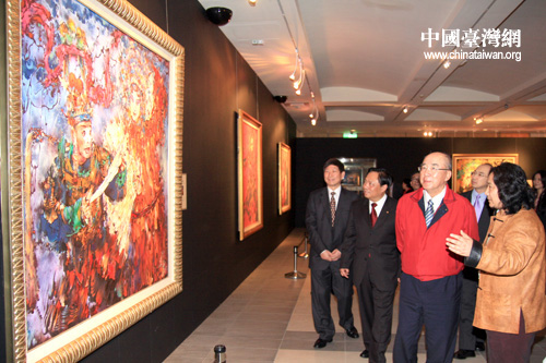 2月1日,中國國民黨榮譽主席吳伯雄在全國臺聯(lián)會長梁國揚陪同下參觀了在臺北市孫中山紀念館展出的國粹油畫精品!。ㄖ袊_灣網(wǎng) 田云鵬 攝)