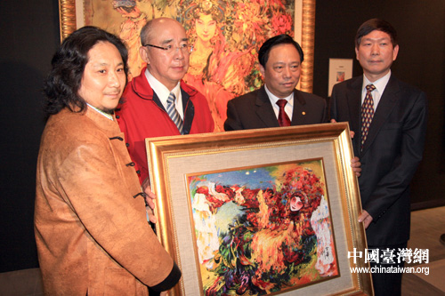 梁國揚向吳伯雄贈送國粹油畫精品《貴妃醉酒》的繡品。(中國臺灣網(wǎng) 田云鵬 攝)