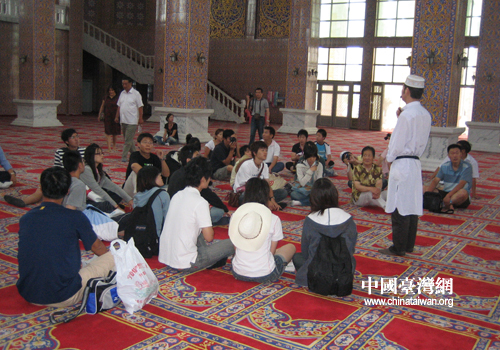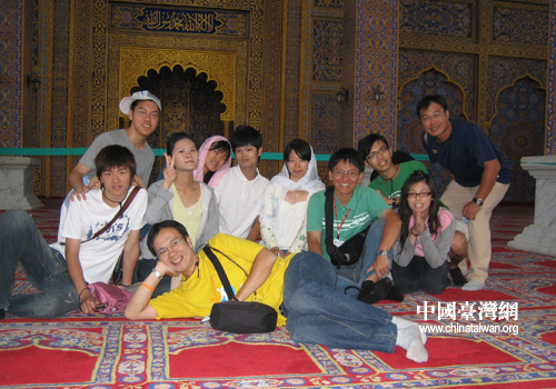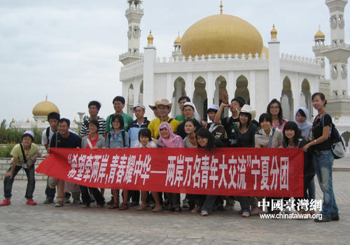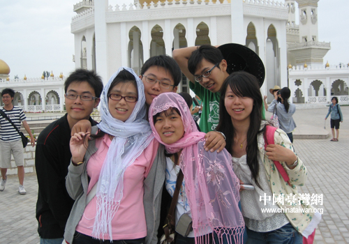 同學(xué)們?cè)诮鸨梯x煌的禮拜大殿前留影(圖片來(lái)源:寧夏臺(tái)辦)