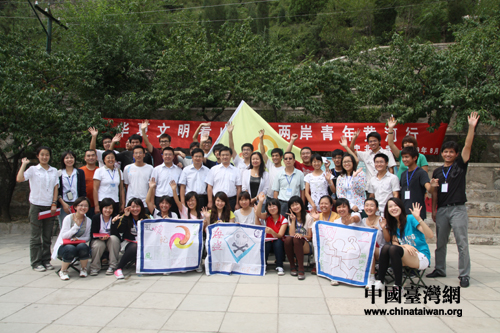 兩岸青年在二龍山愛心臺拓展訓(xùn)練場地合影留念,第一排三面旗幟為三個競賽小隊(duì)隊(duì)旗(中國臺灣網(wǎng) 陳寧 攝)