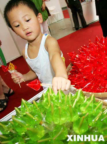 7月20日,一位小朋友正在選購(gòu)由麥芽糖制成的糖果。當(dāng)日,“2007臺(tái)灣優(yōu)質(zhì)農(nóng)產(chǎn)品巡回展覽”在上海農(nóng)業(yè)展覽館開(kāi)展,來(lái)自臺(tái)灣島內(nèi)各級(jí)農(nóng)會(huì)、專業(yè)協(xié)會(huì)及農(nóng)業(yè)企業(yè)等150家單位為本次展覽帶來(lái)了20余種時(shí)令水果、蔬菜和469種農(nóng)產(chǎn)品深加工品。此后,巡回展還將在南京、福州、武漢、廣州、大連五個(gè)城市陸續(xù)展開(kāi)。 新華社記者 裴鑫 攝