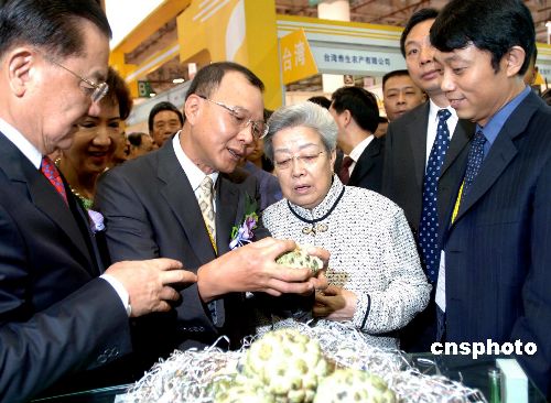 “海峽兩岸農(nóng)業(yè)成果展覽暨項(xiàng)目推介會(huì)”2006年10月19日在廈門舉行。參展的臺(tái)灣客人向國務(wù)院副總理吳儀介紹水果新品。中新社發(fā) 鄭祚聲 攝