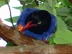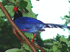 “臺灣藍(lán)鵲”為臺灣地區(qū)特有,與烏鴉同屬鴉科,叫聲同樣沙啞,羽色卻與烏鴉迥然不同,亮麗無比。頭、臉、頸、喉、胸都是黑色,黃色的眼珠包圍黑色的瞳孔,鮮紅色的鳥喙、雙腳,身體上半部可目視處及下半部的腹部呈鮮藍(lán)色,尾下覆羽則為白色,有十二根尾羽,最長二羽為藍(lán)根白尾,其于為黑根白尾,左右對稱。尾羽長占了總體長的三分之二,飛行時總以直線前進(jìn),非常優(yōu)雅高貴。