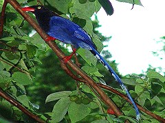 一襲亮藍(lán)的羽絨,橙紅的嘴喙,拖曳著長長的尾羽,跳躍飛翔在山林間,像極了身著藍(lán)旗袍,抿著朱紅的曼妙女子輕盈的手舞足蹈。沒錯!這就是俗稱“長尾山娘”的“臺灣藍(lán)鵲”。