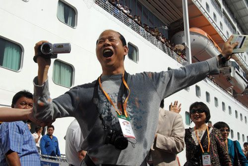3月16日,大陸游客乘坐“海洋神話號”豪華郵輪抵達(dá)臺灣基隆港。