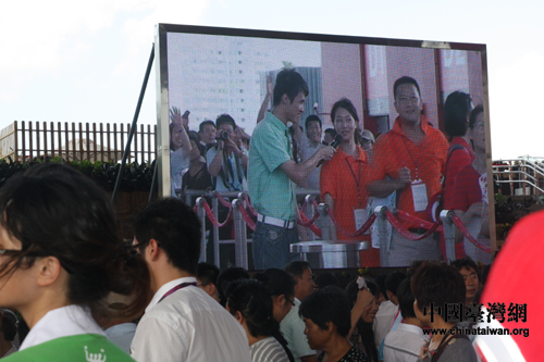 排隊(duì)等候進(jìn)館期間,一位同學(xué)接受中國(guó)館表演區(qū)主持人的現(xiàn)場(chǎng)采訪。(中國(guó)臺(tái)灣網(wǎng) 肖燕 攝)