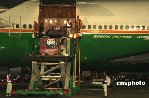 12月23日下午6時許,抵達(dá)臺北桃園機(jī)場的大陸贈臺大熊貓“團(tuán)團(tuán)”、“圓圓”經(jīng)過檢疫程序后,它們的箱籠從長榮航空專機(jī)出艙。 中新社發(fā) 陳立宇 攝